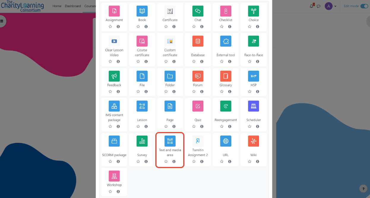 With the course page open, you’ll now need to follow the steps below in order to add the Text and Media Area activity to the course: