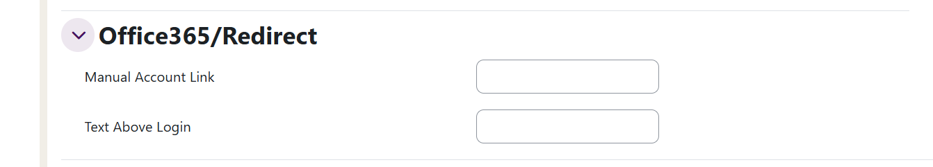 Then you can enable the Office 365 or Redirect option (depending on the authentication method you've chosen). It's important to note, when enabling an additional form of authentication this takes precedence on the login page,so you'll need to ensure you enable the manual account link to allow Administrators to access the platform, this is done by adding text or a link to the following section: