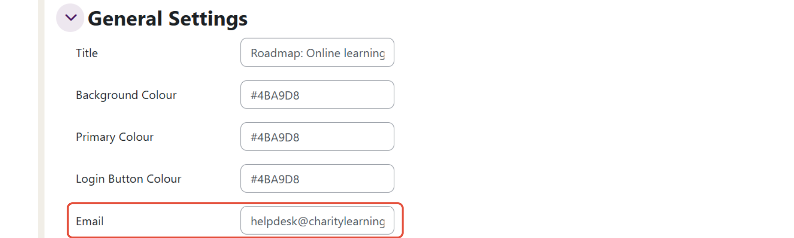 You can then find the section you want to update, click on the text box for that section and update this as required. For example, the Email on the login page can be updated from the Email text box under the General settings, as shown below: